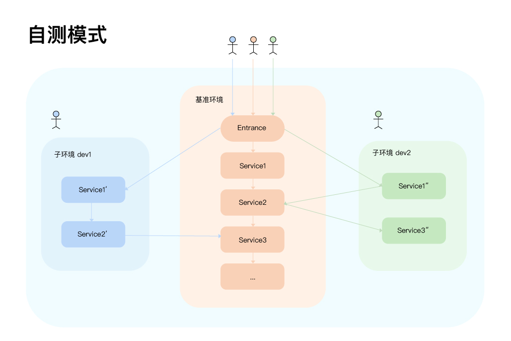 自测模式是 Zadig 为降低环境管理复杂度和部署成本而推出的一种面向开发者的功能模块。当开启了环境的自测模式后,该环境则成为基准环境,开发者们可以基于基准环境快速复制出属于自己的自测环境(即:子环境),并且只关注和自己日常改动相关的服务。对于其上下游服务无需理会,基准环境中会提供这部分服务的能力。图示如下: