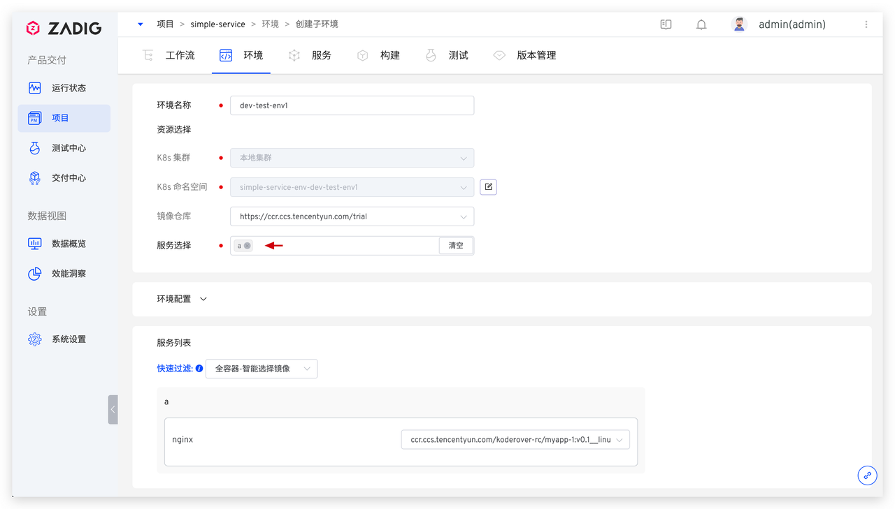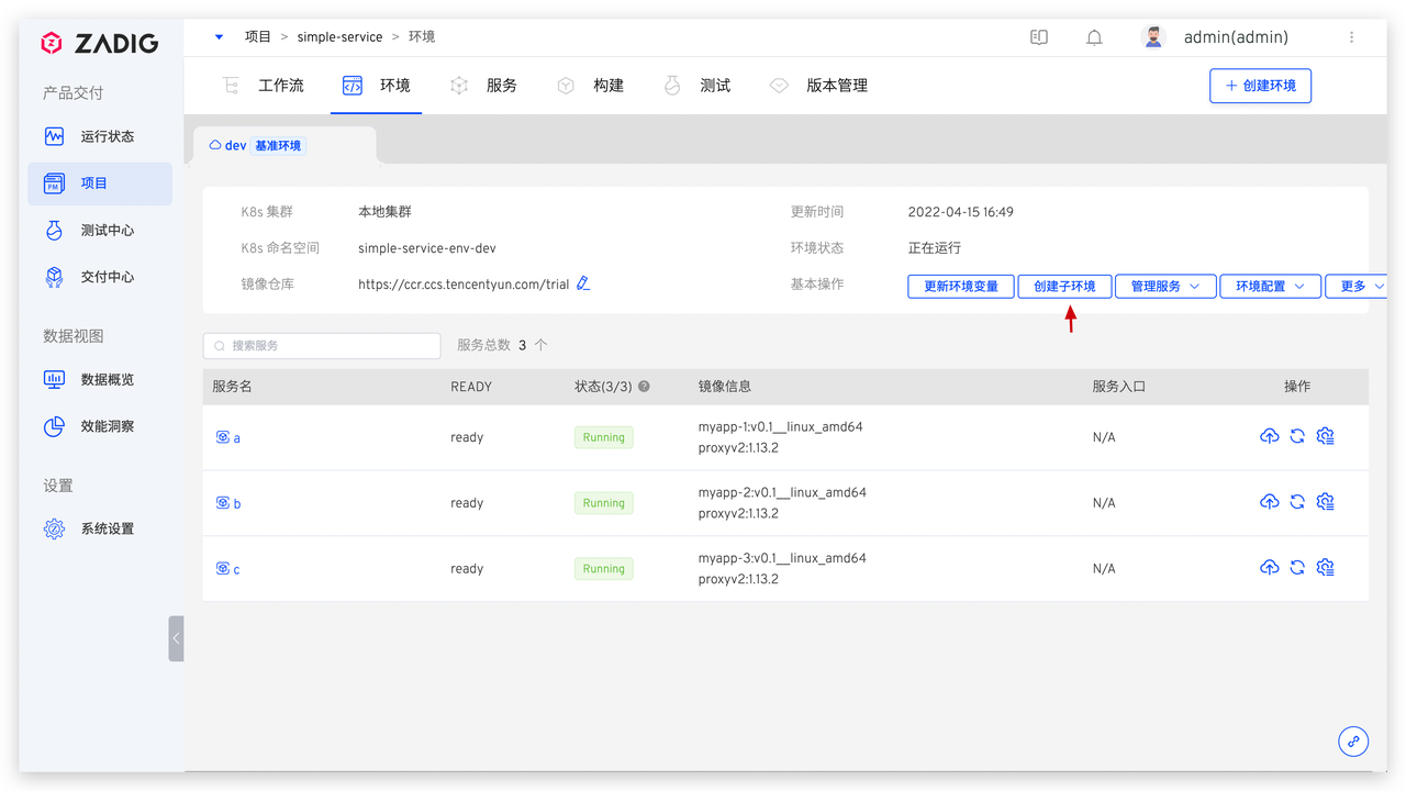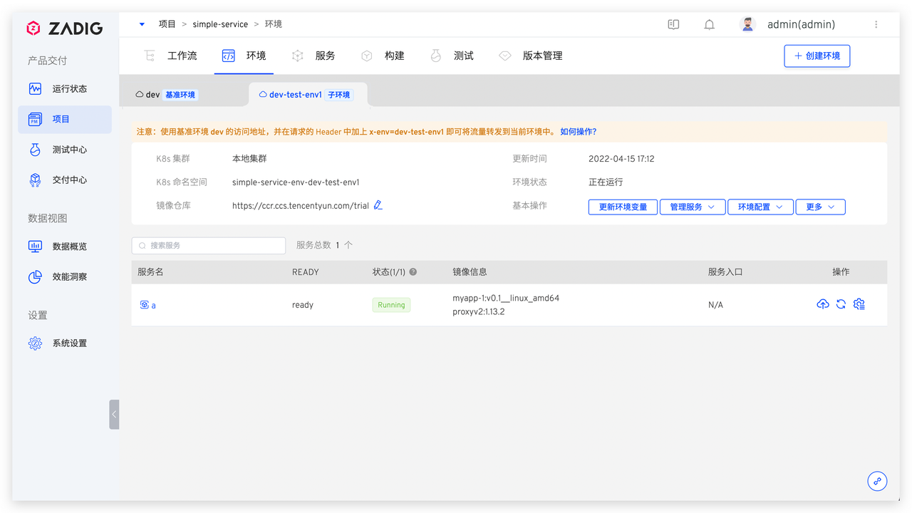 在 dev 基准环境中通过点击创建子环境,选择 a 服务可创建包含 a 服务的子环境 dev-test-env1: