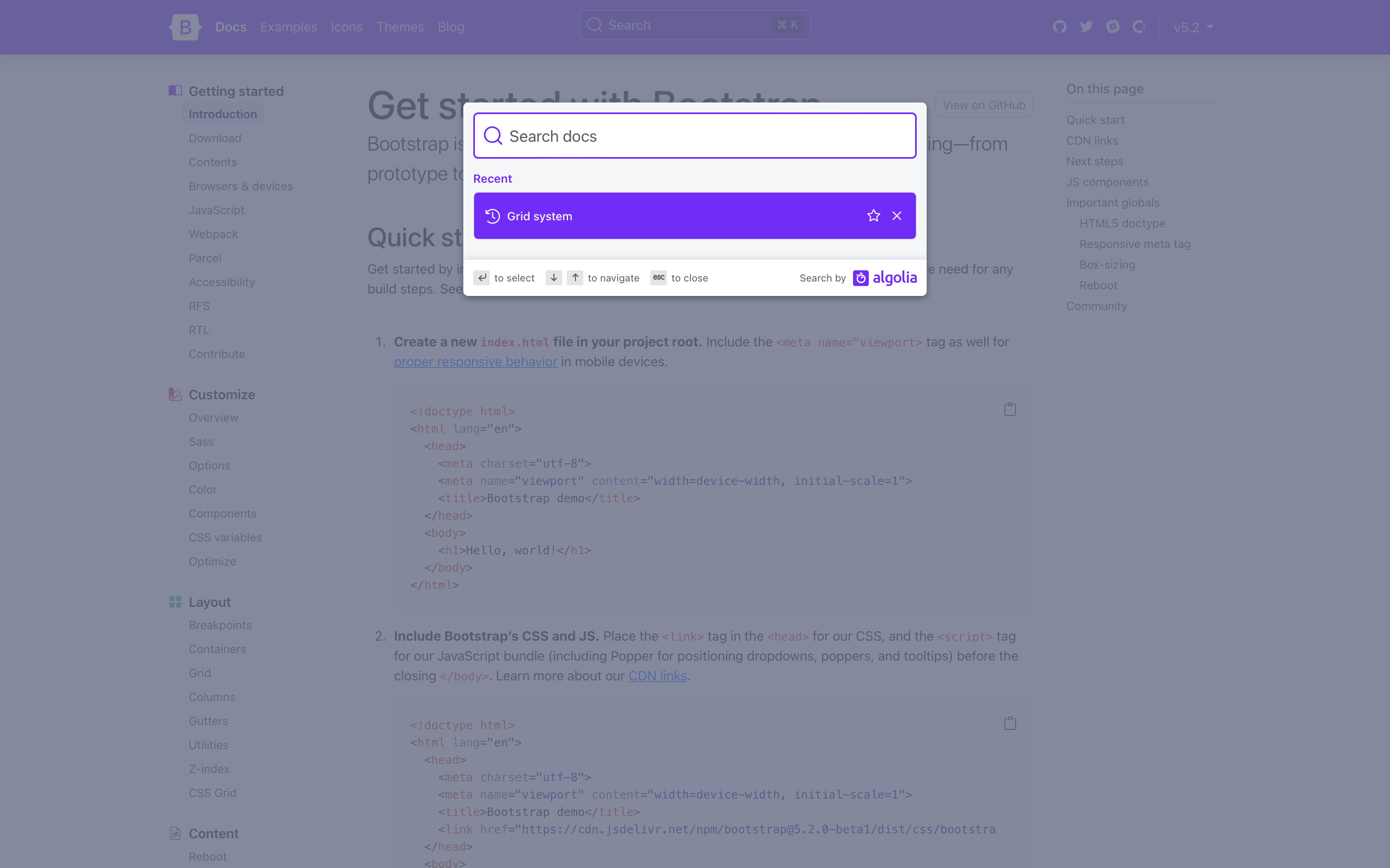 变化包括简化了导航栏,取消了子导航,并更改了侧边栏以始终显示每个页面链接以提高可发现性。上面显示的也是更新后的快速入门指南,它现在是通过 CDN 使用 Bootstrap 的分步指导指南。