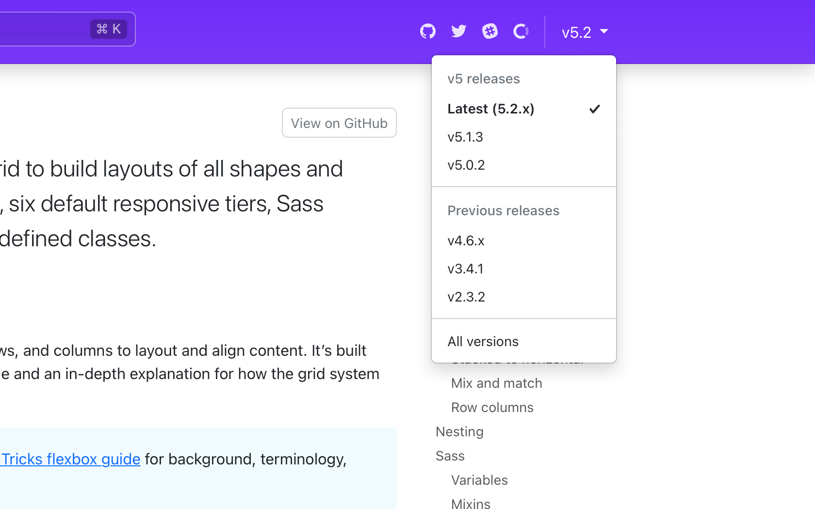 更新后的导航栏还有一个新版本选择器,适用于 v5.2.0 及更高版本。在任何页面上,单击版本并查看选项以导航到同一页面的先前次要版本。当一个页面不存在于旧版本时,你会在下拉列表中看到禁用的版本。官方表示,其目前没有计划跨主要版本链接页面。