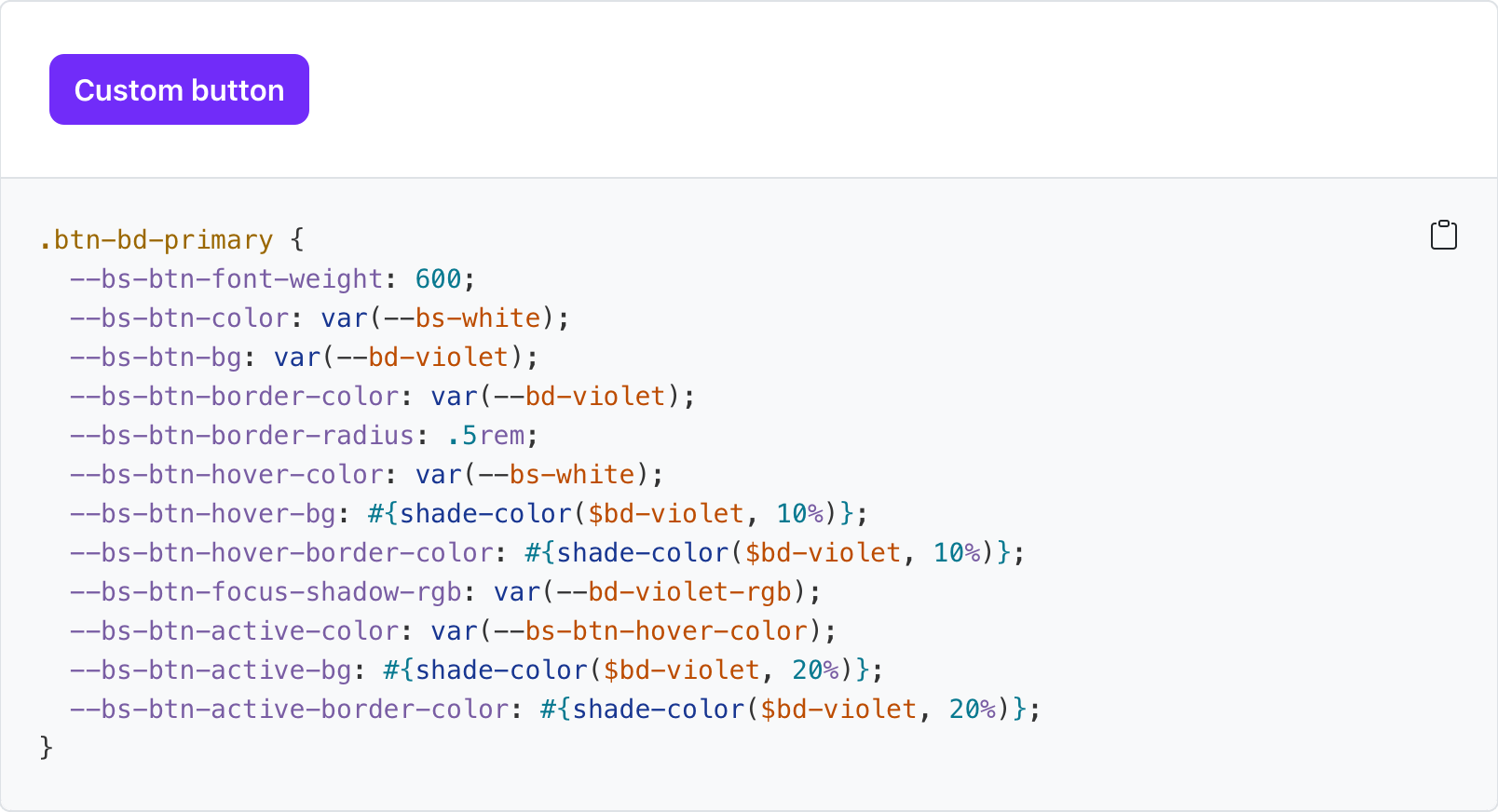 在此版本中,所有的组件现在都包含 CSS 变量,以实现实时自定义、更轻松的主题化以及(很快)从 dark 模式开始的颜色模式支持。每个组件页面都已更新,包括相关 CSS 变量的参考指南。以 buttons 为例: