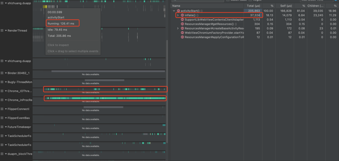 从图中可以看出h5 页面加载之前 耗时 分布在 activityStart() 函数,该函数 包含了 onCreateView ,其中耗时最长是 布局填充 inflate(),因为 WebView 对象是提前创建好的,直接从对象池中取出的,所以耗时主要在 初始化过程,WebView 自身的初始化 WebViewChromiumFactoryProvider. startYourEngines (耗时 87 us,不到 1 ms),耗时还有 WebView 的一些其他初始化,jockey 的初始化 等等。