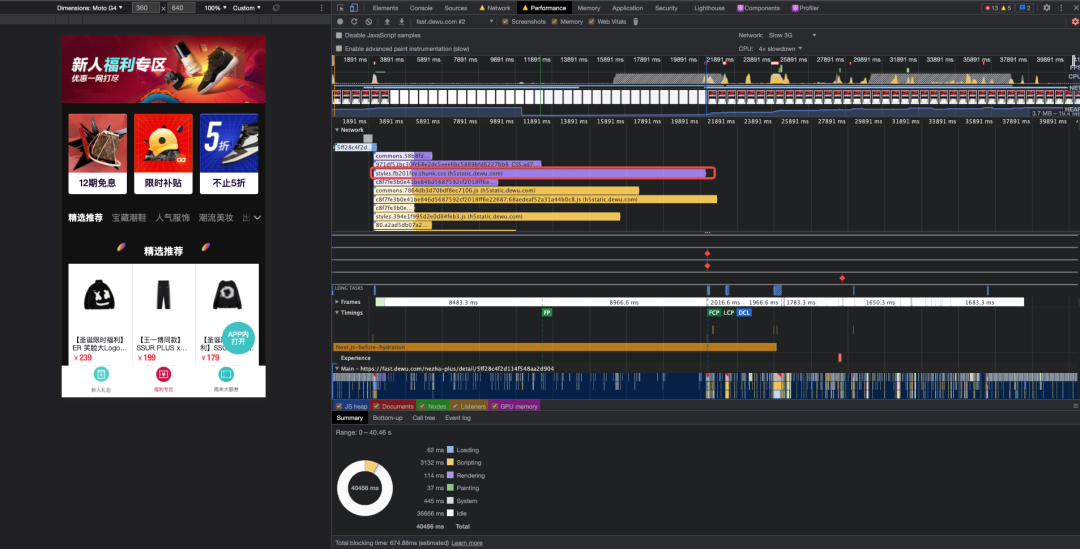 众所周知 css 加载会阻塞HTML渲染,最终将首屏公共css从118kb缩减至38kb,下图通过 chrome 模拟弱网环境下的SSR页面加载时序图。从图中可以看出 styles.fb201fce.chunk.css 下载耗时 18s,阻塞了页面的渲染,HTML 主文档耗时 2.38s 就已经下载完成了,但是实际渲染时间却是在 20s 之后。