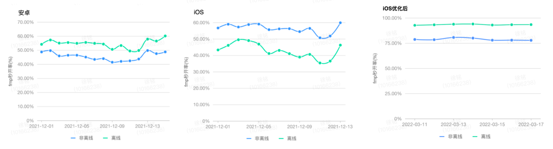 至此功能开发完成上线,先来一组线上收益数据,安卓开启离线情况有有10%左右的收益,但是iOS开启离线的反而秒开率更低。经过修复处理后iOS也可提升10%以上的秒开。