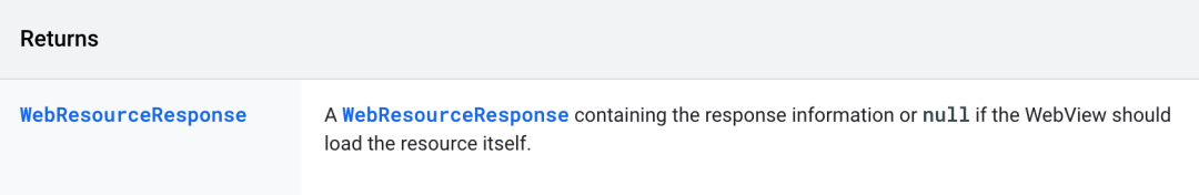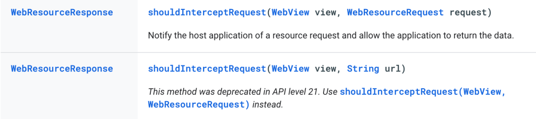 资源拦截这块安卓这边实现比较简单,WebView支持 shouldInterceptRequest, 可以在该方法内检测是否需要进行资源拦截,需要的话返回 WebResourceResponse 对象,不需要直接返回 null。