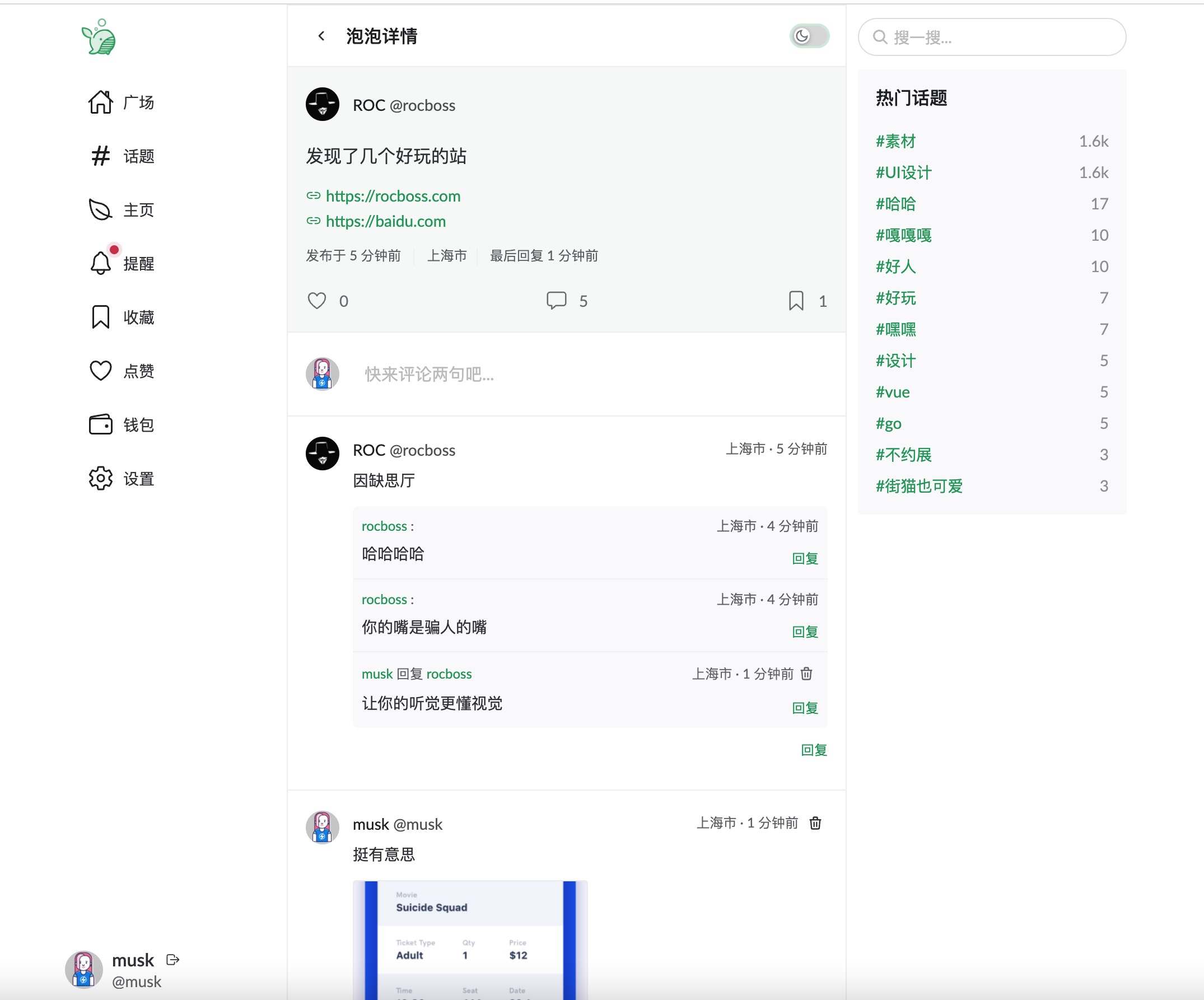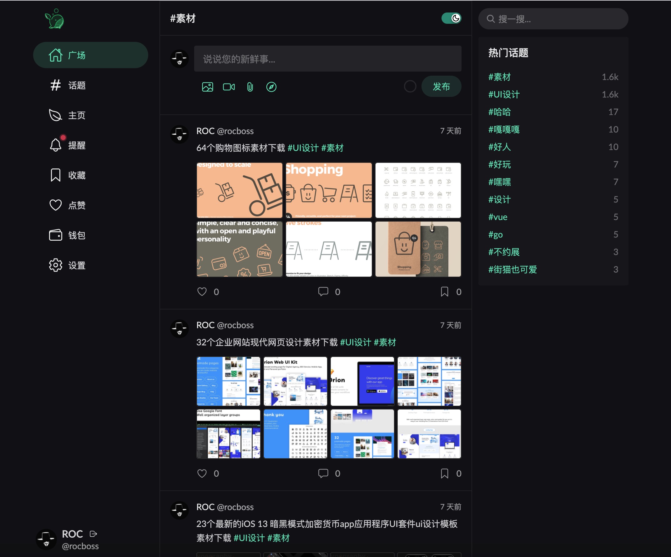 这是一整使用 Go+Vue+Zinc 架构的社交系统,前端由 Vue3 构建,采用小清新风格,布局类似Twitter的三栏设计。