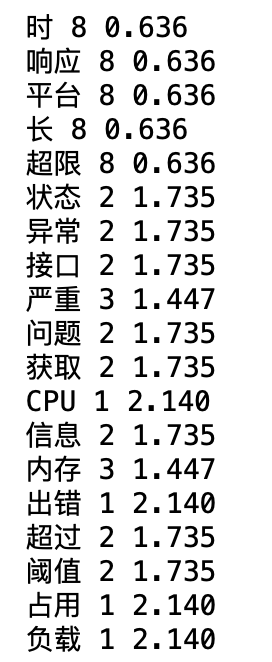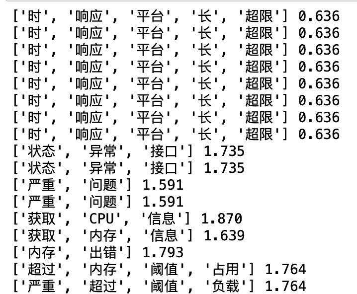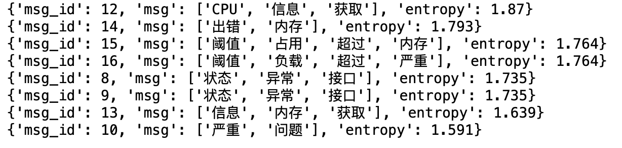 以下以自定义的一组告警消息(17条)和停用词,展开实验。停用词是指在处理自然语言数据(或文本)之前自动过滤掉某些字或词,以避免无意义的单词影响文本熵的计算结果,这些字或词即被称为Stop Words(停用词)。本实验中由于实验文本数据样本较小,所以只是针对性地引入了一些停用词。