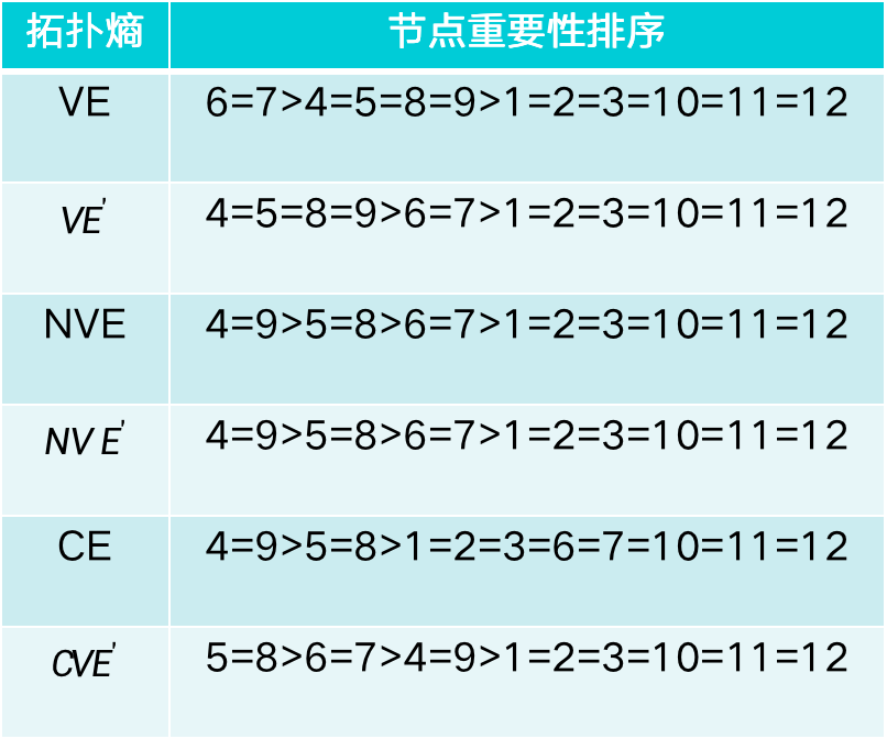 根据拓扑熵的计算方法得出的节点重要性排序如下表所示,根据经验,4、5、8、9在该网络中应重要性靠前,6、7相比于1、2、3、10、11、12应重要性较大,在这个网络结构下,NVE和NVE'的排序结果更符合实际情况。在其他网络结构下,可能需要进一步具体问题具体分析。