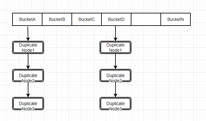 右表可能含有重复的数据,所以会有 Duplicate Node。这里的重复数据是指 Join Key(Join 条件对应的列)的数据重复,并且其他列不重复,所以要分别缓存。注意上述图中,是通过 Hash 算法解决 Hash 冲突的问题,即不会把不同的 Join Key 放在同一个桶中。当然,现实操作中也有把不同的 Join Key 放在同一个桶中的情况,那需要遍历 List 才能确定查找的 Join Key 是否存在。