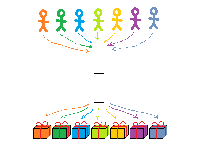 对于有标签的礼物,不需要排队,每个人都可以直接找到自己的礼物。或许并非如此,想象一下,如果是数千个孩子同时去找礼物会是什么境况?这时如果不排队,肯定会乱成一团糟。所以这种情况下,我们也需要排成一个或几个队列,但这里的排队方式的选择只会在效率上有所不同,并不会影响孩子最终拿到手的礼物。