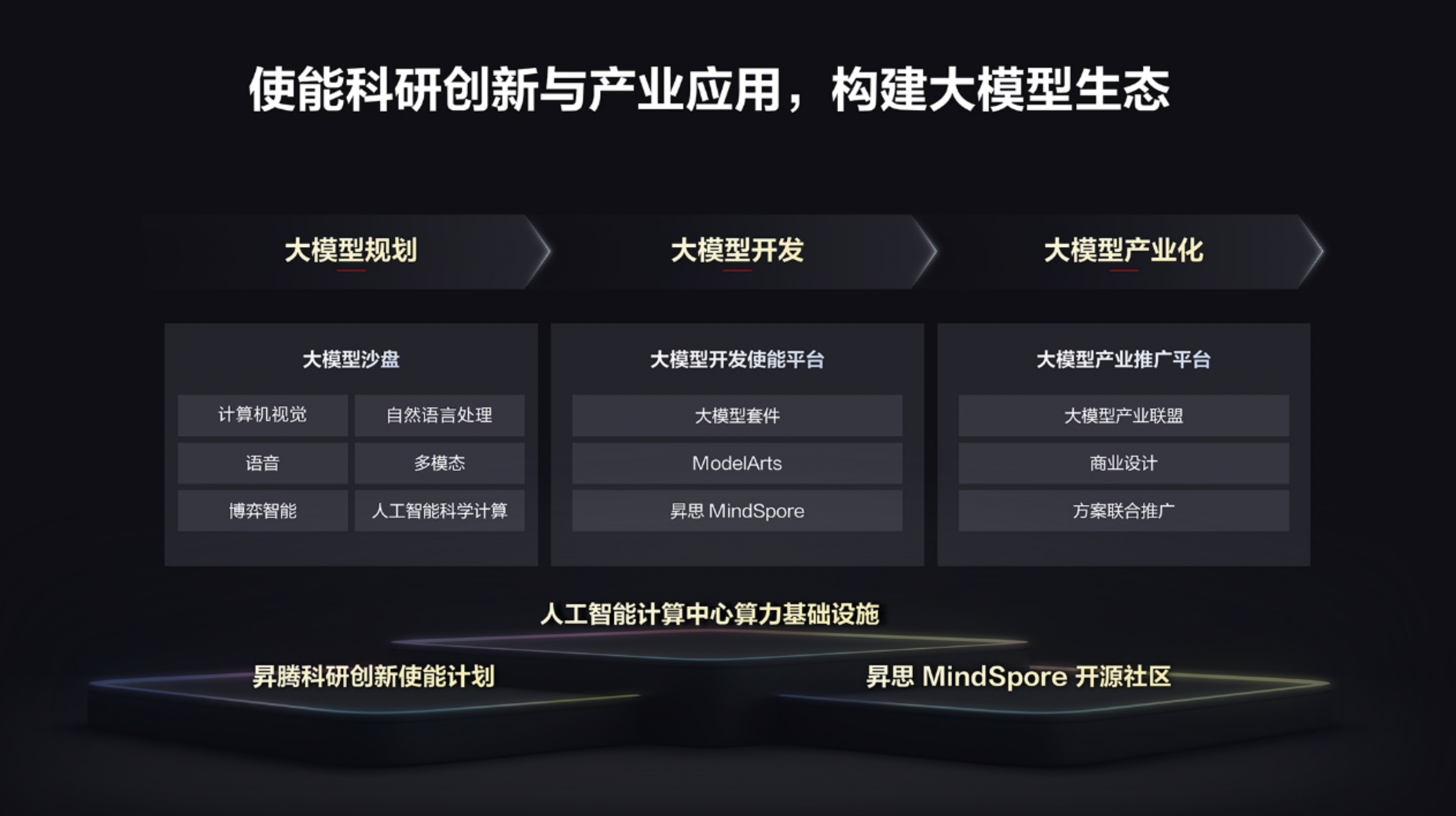 - 规划昇腾大模型沙盘,构筑中国大模型创新高地。过去的一年,产业界基于昇腾AI先后推出鹏程.盘古、鹏程.神农、紫东.太初、武汉.LuoJia、华为云盘古系列等有影响力的大模型。今年,华为发布昇腾科研创新使能计划,鼓励高校和科研机构开展大模型的研究与创新,在每个领域和行业打造出世界级领先的大模型。