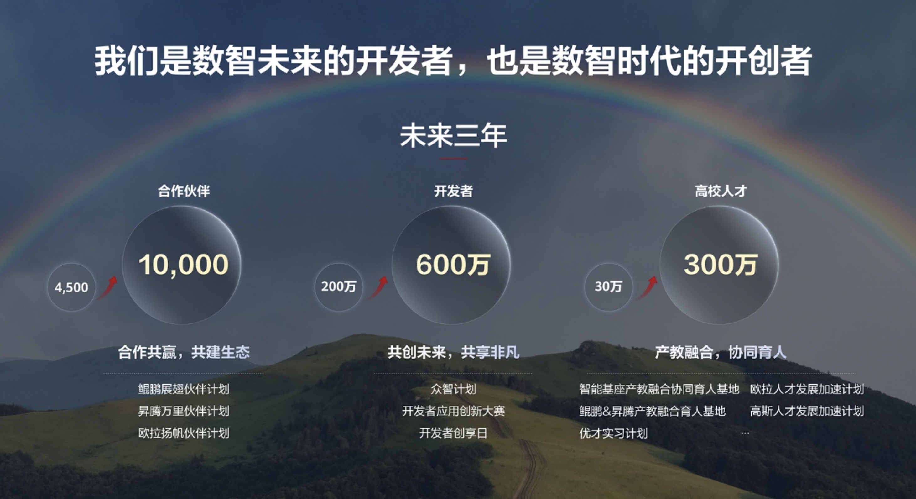 鲲鹏、昇腾计算产业的高速发展,离不开生态伙伴和开发者的共同努力。未来三年,华为将计划发展万家合作伙伴、600万开发者,培养300万鲲鹏、昇腾原生的高校人才,全面加速计算产业生态发展,共赢数智新时代,共创数智新未来!