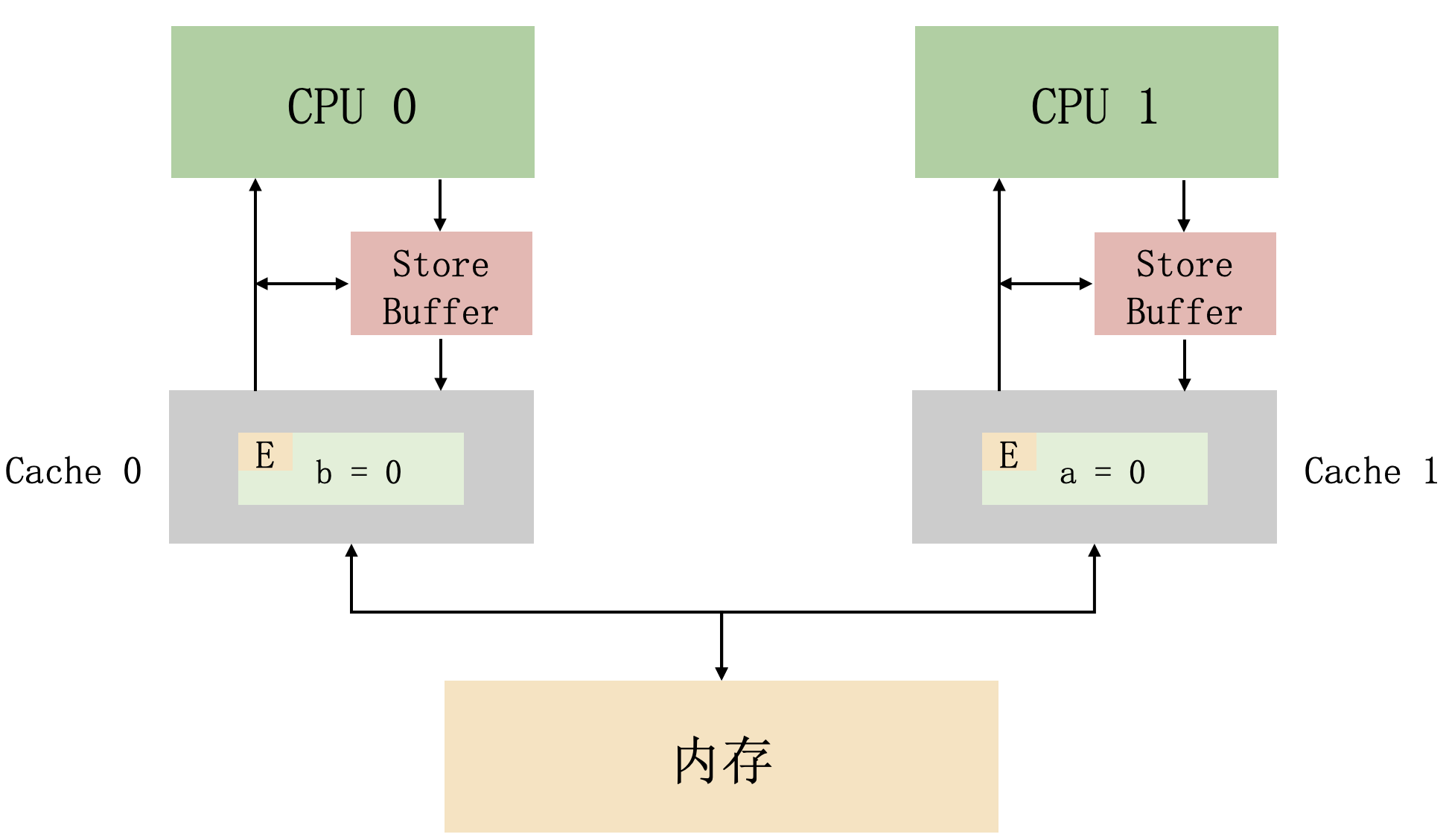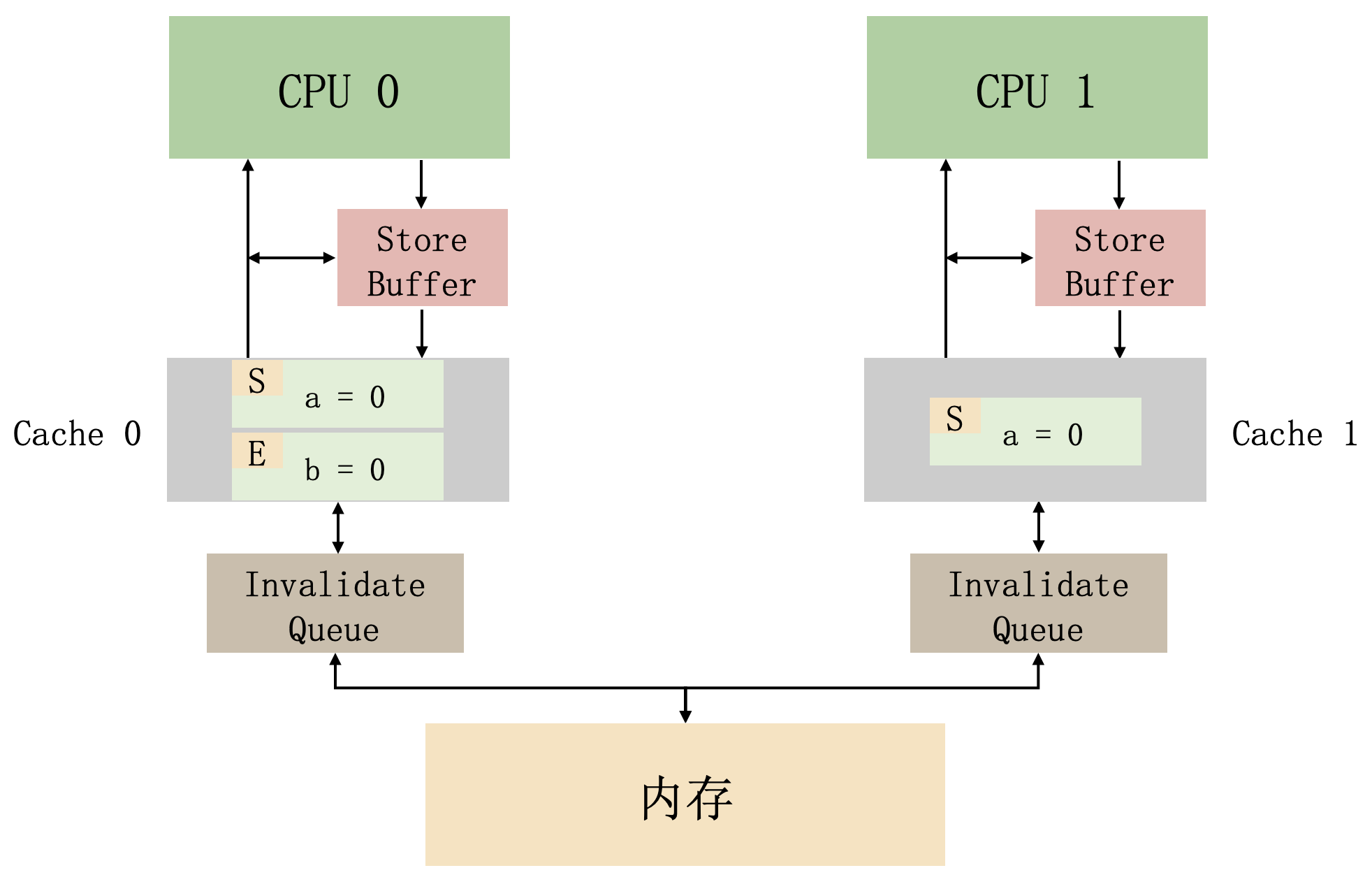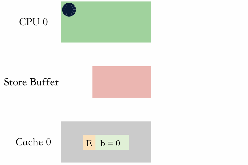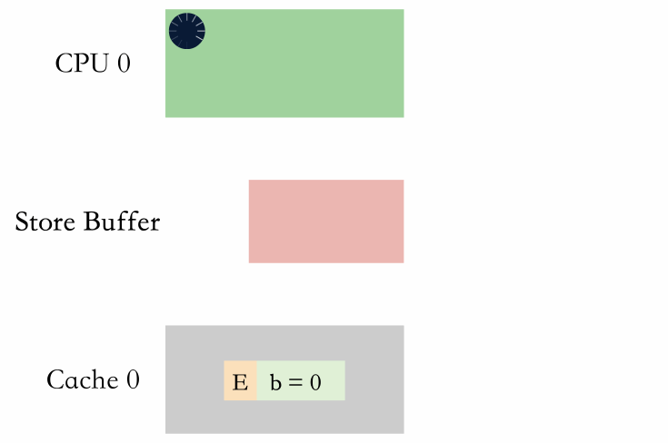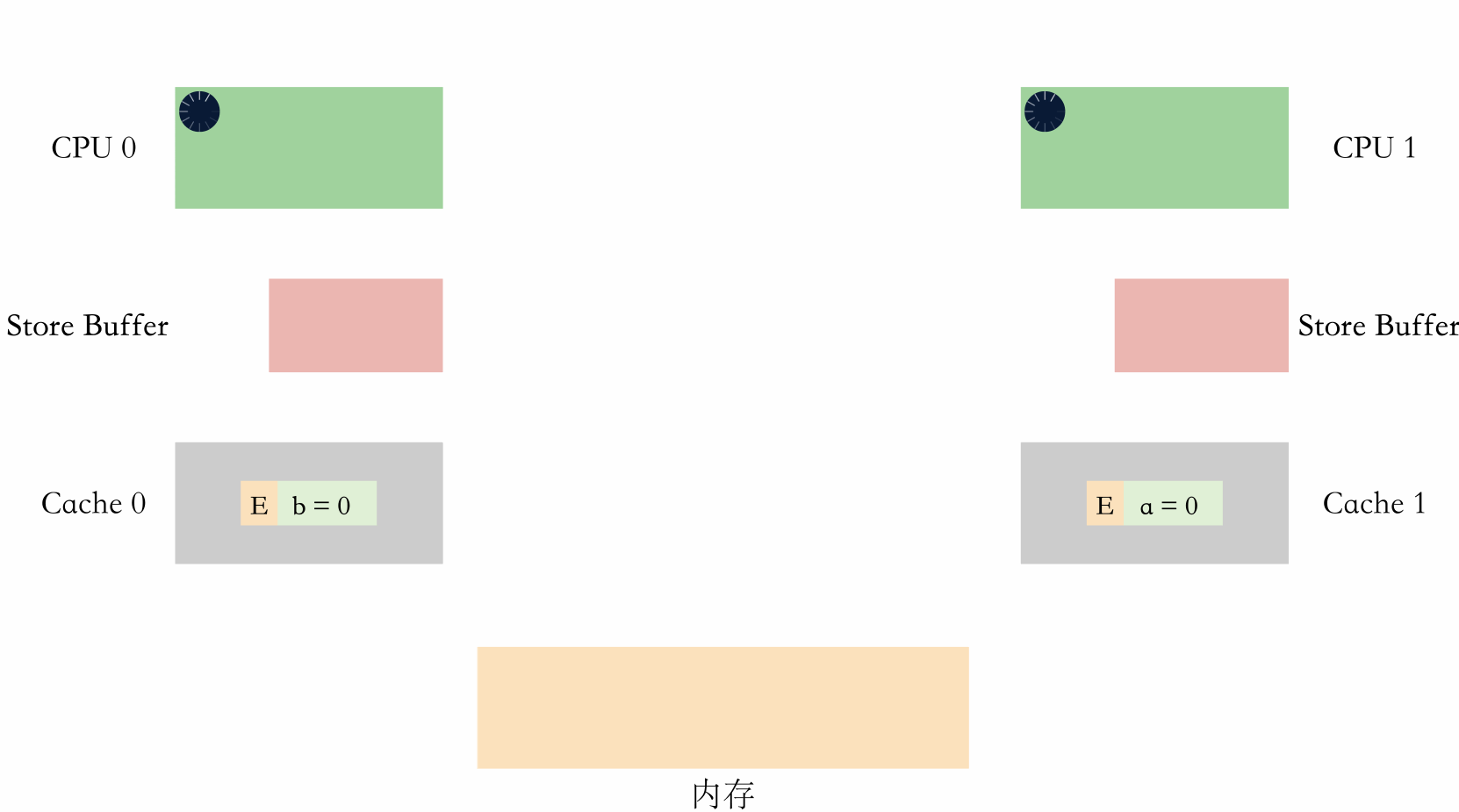 - CPU0 执行 a=1。对应的缓存行在 cpu0 的缓存中是只读的,所以 cpu0 把新值 a=1 放在了它的 store buffer 中,并发送了一个 invalidate 消息,以便从 cpu1 的 cache 中刷新对应的缓存行。
