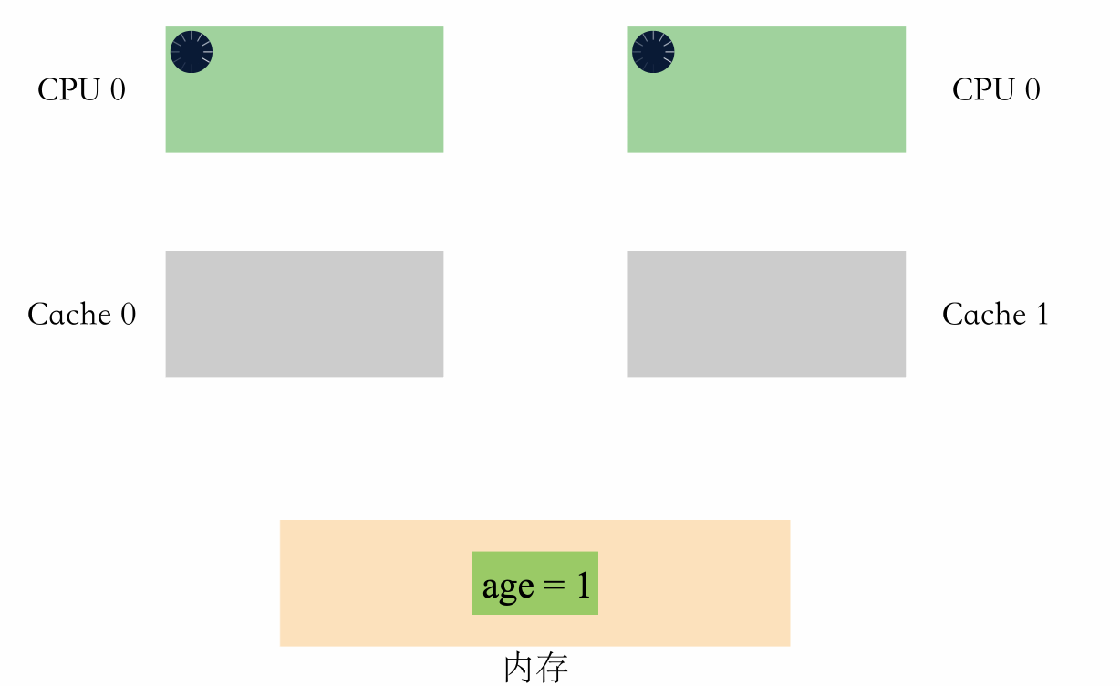 可以看到,两个 CPU 同时对 age=1 进行加一操作,因为多组缓存的原因,CPU 之间无法感知对方的修改,数据出现了不一致,导致最后的结果不是预期的值。