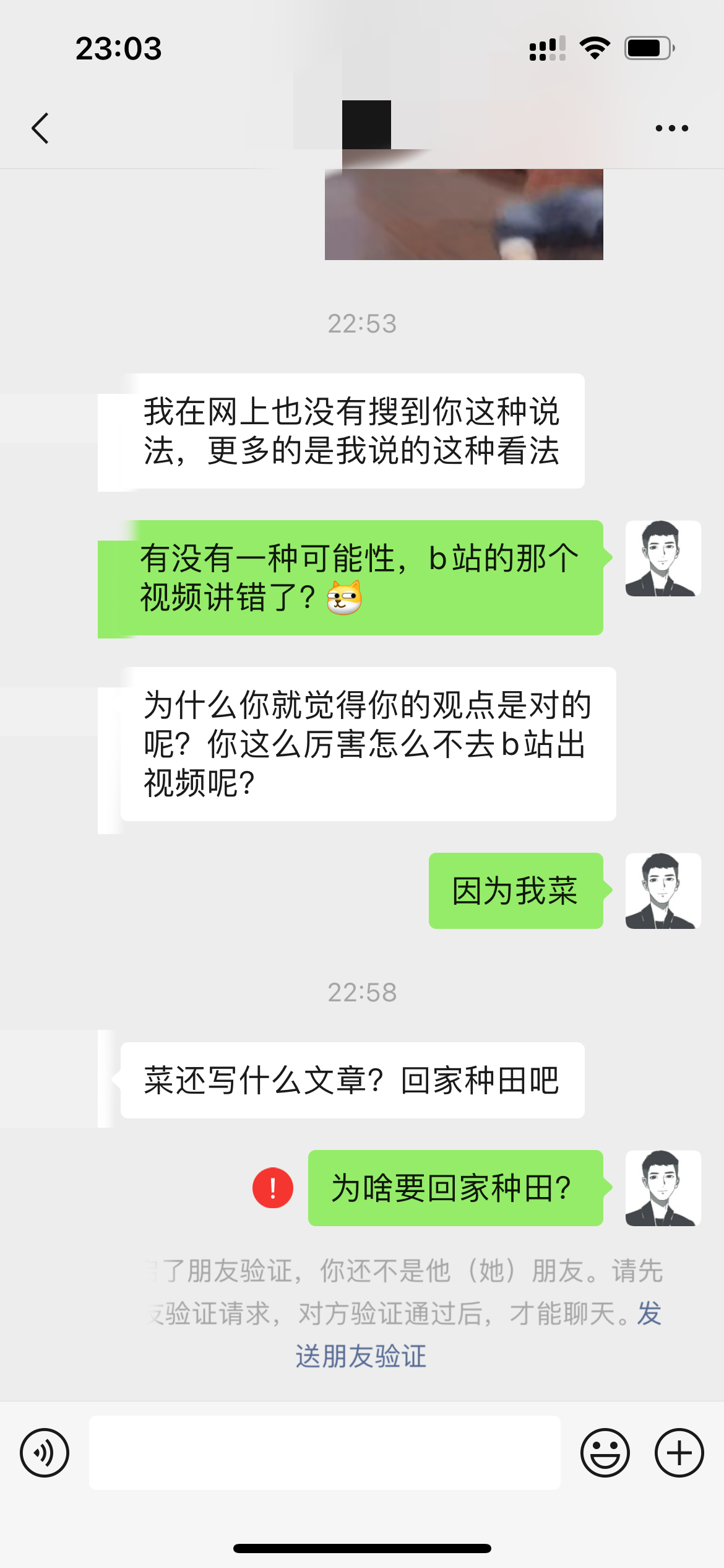 可能是我发的那个狗头的表情,让这位读者认为我不尊重他。于是,这位读者一气之下把我删掉了,在删好友之前,还叫我回家种田。