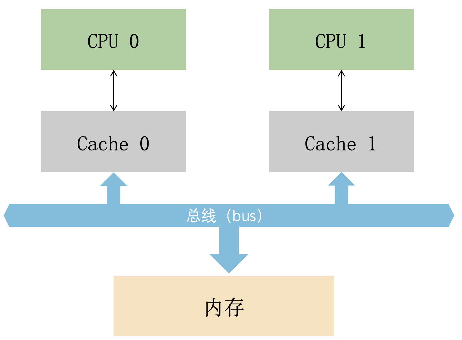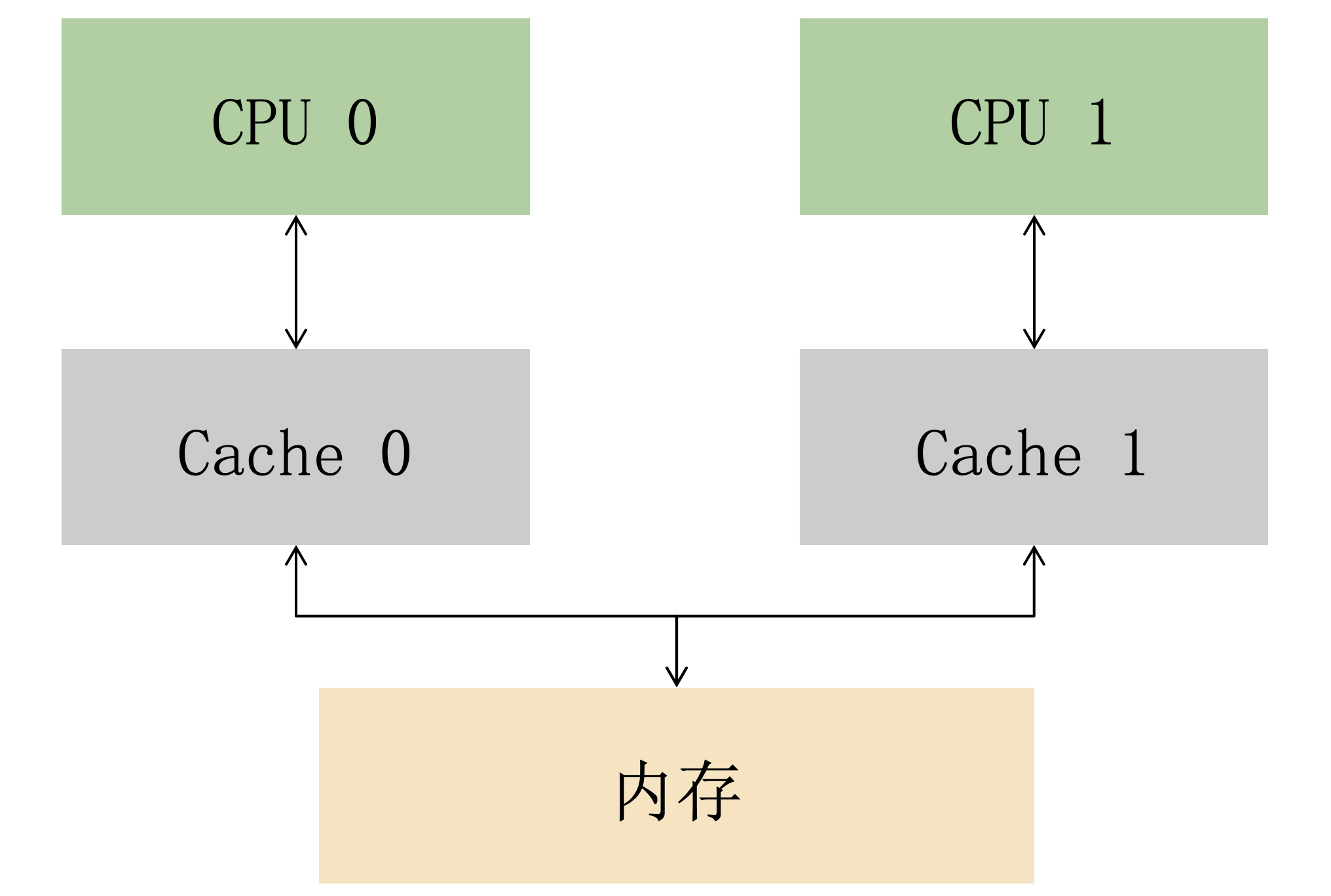 于是,多个 CPU 的缓存结构就成了这样(简化了多级缓存):
