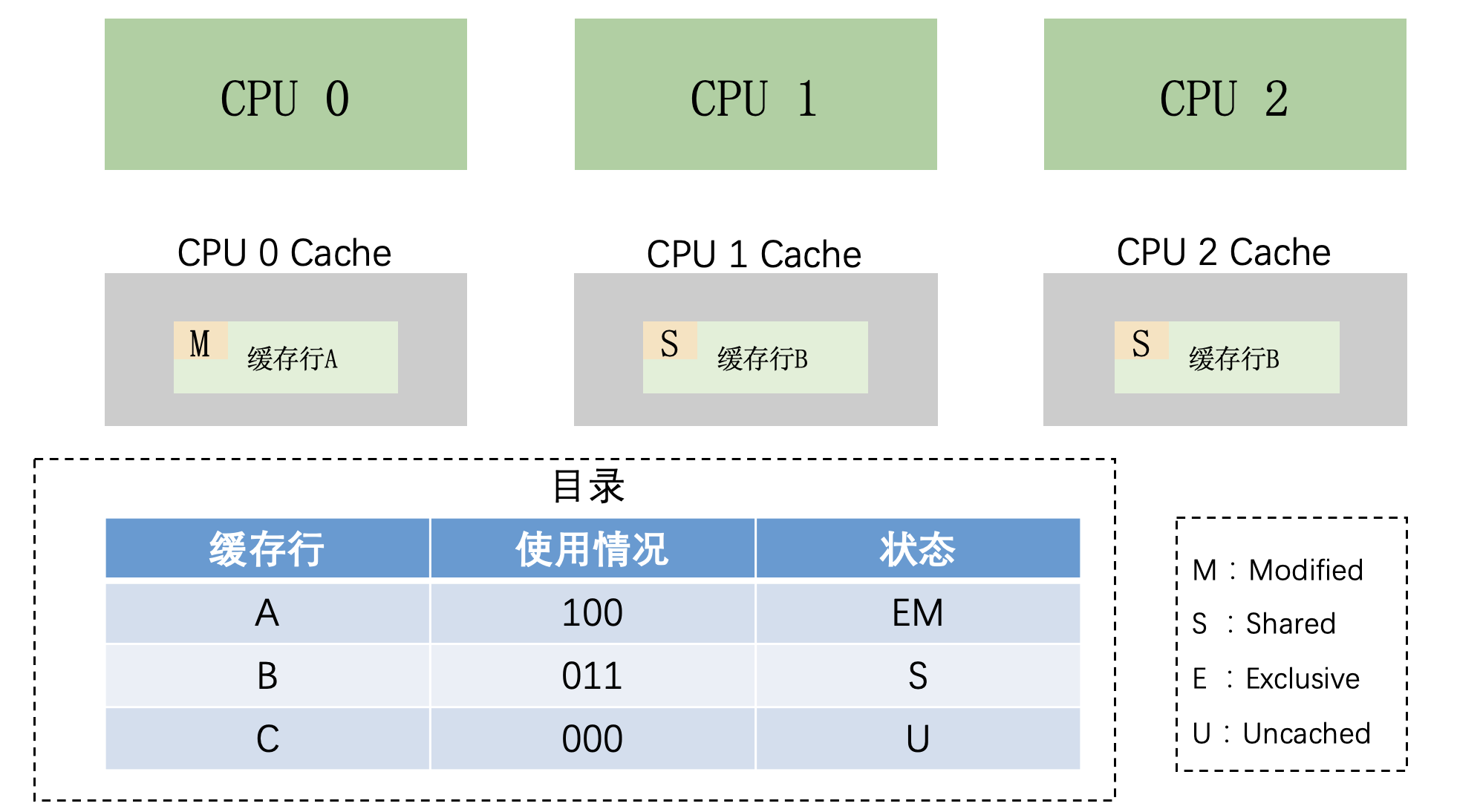 说直白一点就是用一个目录去记录缓存行的使用情况,然后 CPU 要使用某个缓存行的时候,先通过查目录获取此缓存行的使用情况,用这样的方式保证数据一致性。