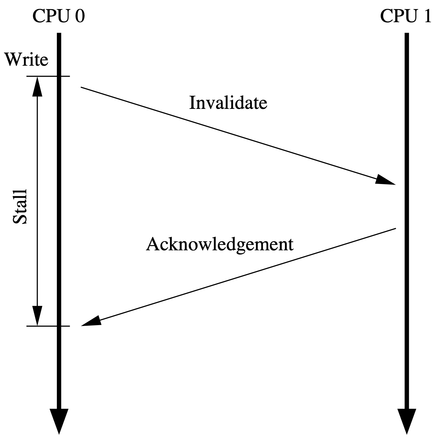 - CPU1 接收到 a 的 invalidate 消息,将其放入自己的 invalidate 队列,并向 CPU0 发送一个 invalidate 确认消息。注意,原来的值“a”仍然保存在 CPU1 的缓存中。