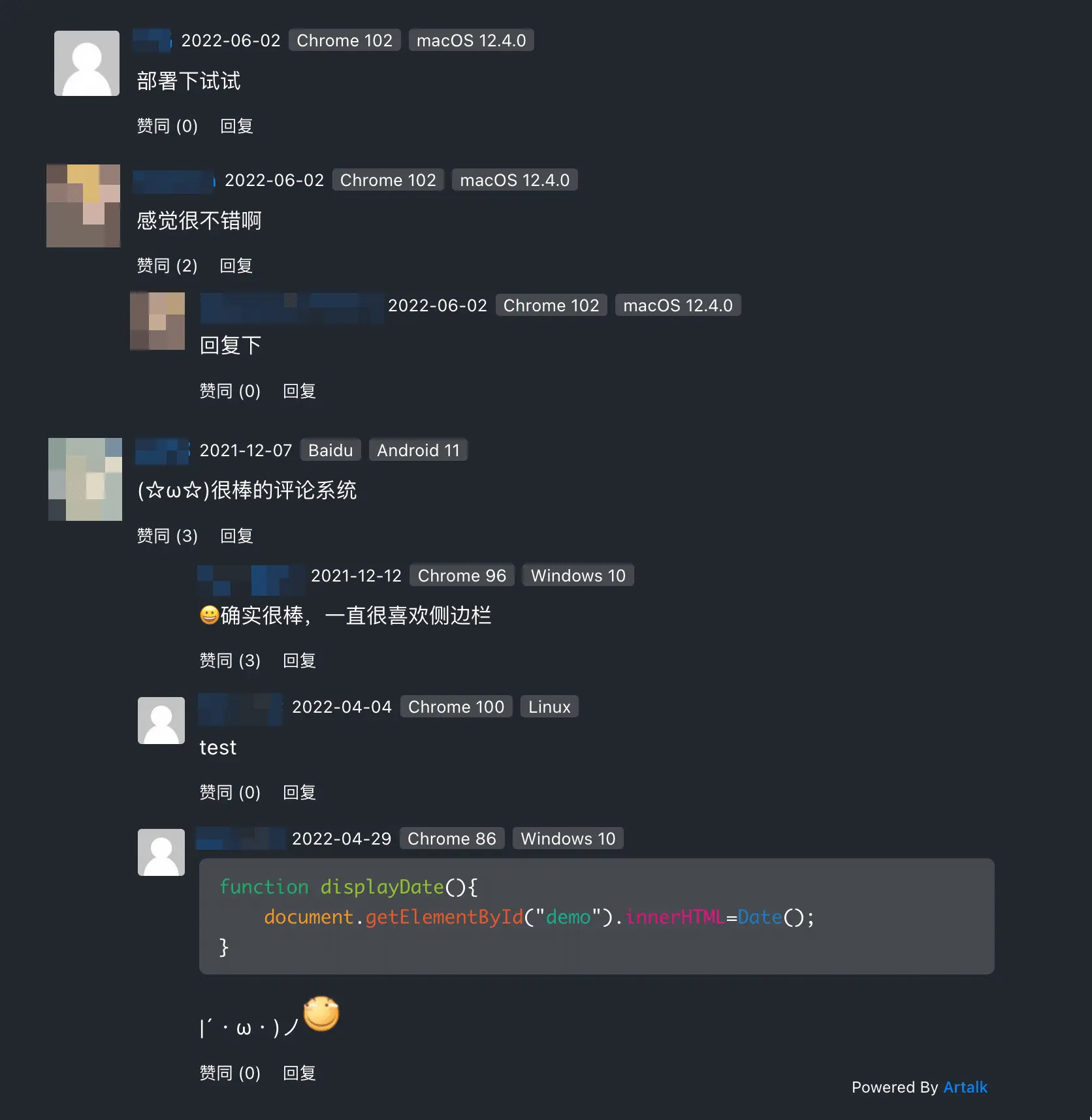 Artalk 是一款简洁的自托管评论系统,前端采用 TypeScript (Vanilla JS),后端采用 Golang,功能非常强悍,Markdown 语法 + 代码高亮、显示浏览器和操作系统、多形式推送(比如邮件、TG、钉钉、飞书等),还支持其他平台评论数据快速迁移。