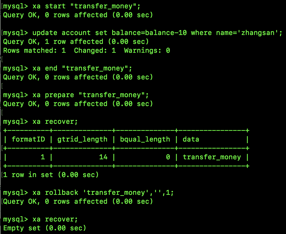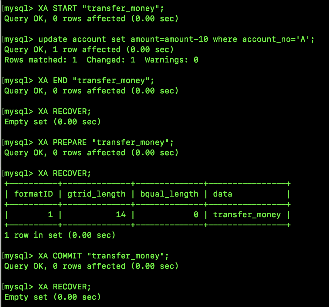 XA COMMIT "transfer_money":这个用来提交事务,提交之后,事务的状态就是 COMMITED。