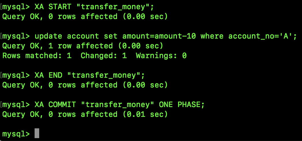 比如说转账操作,我用 MySQL 中的 XA 事务来和大家演示一下从一个账户中转出 10 块钱: