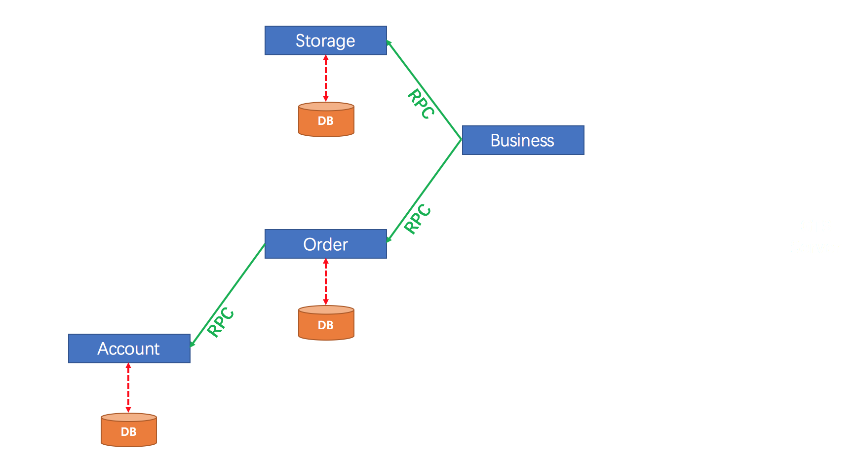 这个案例就是一个典型的分布式事务问题,storage、order 以及 account 中的事务分属于不同的微服务,但是我们希望他们同时成功或者同时失败。
