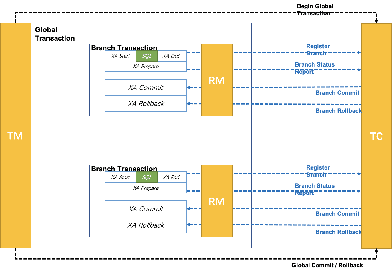 XA Commit 完成事务的最终提交,否则 TC 通知所有 RM 执行 XA Rollback 进行事务回滚。