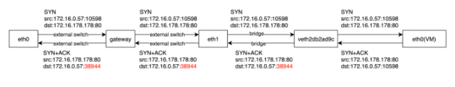 因此,我们合理猜测在网桥转发 SYN/ACK 报文的过程中发生了一次网络地址转换(NAT)。