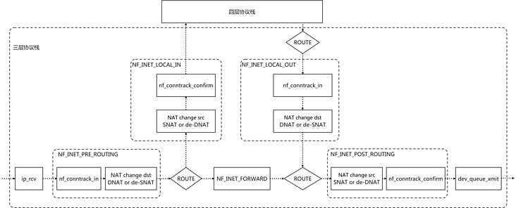 通过 Linux 内核中的 netfilter 源码以及netfilter在三层协议上的结构图,我们可以看到,NF_IP_PRI_NAT_DST参数表明,pre-routing 链上的 NAT 钩子只会改变报文的目的地址,即在 pre-routing 链上只会发生 DNAT 或者 de-SNAT。