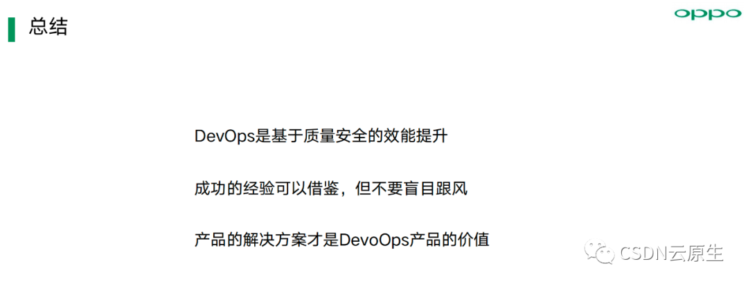 OPPO做研发云这个DevOps平台,是基于质量安全的研发效能提升。我们内部讨论了很多,也借鉴了很多业界成功案例,比如阿里、腾讯、字节,但发现其实由于业务本身的不同,公司企业文化和流程差异,照搬经验未必合适,还是需要根据自己的实际情况去做出相应的调整。DevOps平台在各大公司内部或多或少都有对应的产品,这些产品的模块看似几乎无差别,但作为B端的产品,拥有什么样的产品能力,其实并不能体现它的价值,最终这个产品能帮助用户解决什么问题才能体现价值,所以产品能力建设的同时,产品解决方案的落地是极其重要的。