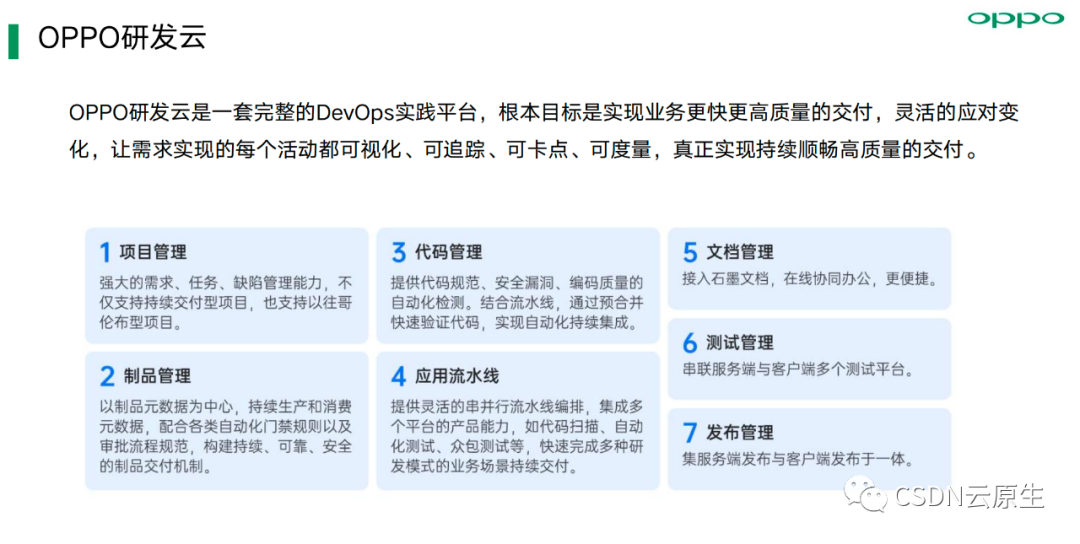 OPPO研发云是一套完整的DevOps实践平台,根本目标是让业务更快、更高质量地交付,灵活地应对变化,让需求的每个活动都可以可视化、可追踪、可卡点、可度量,最终真正实现顺畅的高质量交互。它主要包含几个产品板块:项目管理、制品管理、代码管理、应用流水线、文档管理、测试管理以及发布管理。