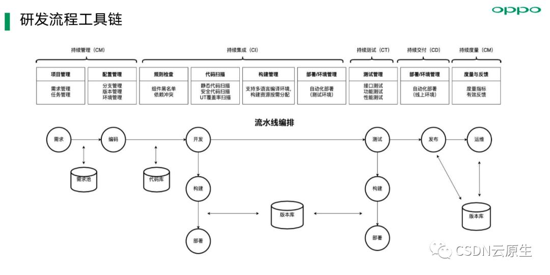 OPPO产品架构中展示了很多相关产品能力,这些产品能力将体现在研发流程工具中。OPPO研发云平台基本流程工具链体现如下:
