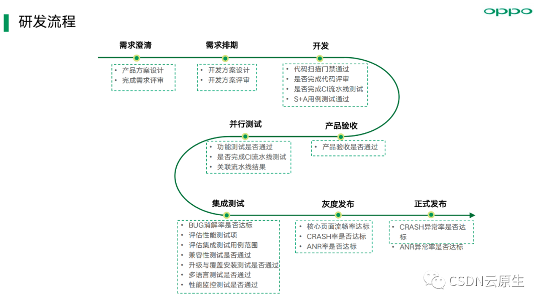 在OPPO,研发流程的大概路线是:需求澄清-需求排期-需求开发-产品测试&验收-灰度发布-正式发布。