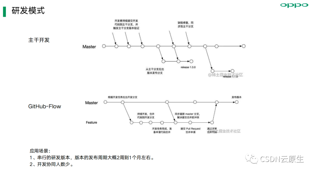 在OPPO业务中,大部分的客户端开发产品会选择主干开发或者Github-Flow,因为客户端发布周期相对较长,并且基本都是按照版本串行发布。部分服务端业务,开发团队人数少,发布周期不频繁,也会选择主干开发或者GitHub-Flow模式。