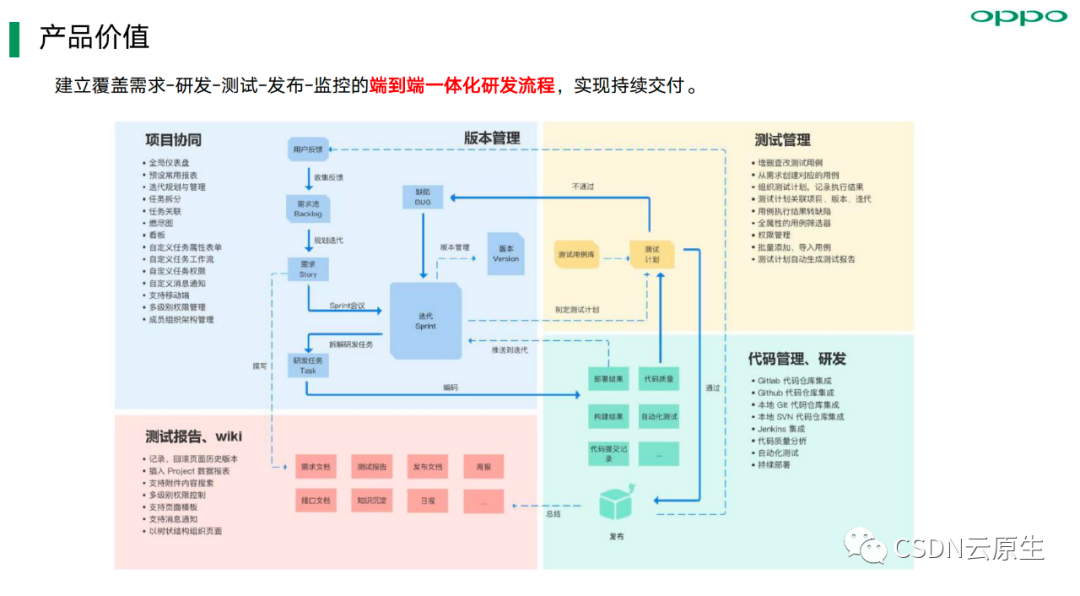 OPPO研发云的产品价值是建立覆盖“需求-研发-测试-发布-监控”的端到端一体化研发流程,实现持续交付。一个项目开始,从分析需求到需求规划,从规划版本再到研发测试,最后到发布上线以及监控反馈,形成研发交付质量与效能闭环。