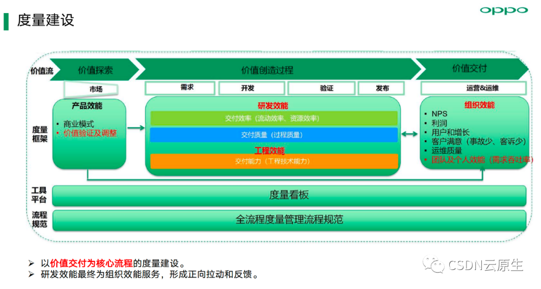 OPPO研发云度量指标的建设,是以价值交付为核心流程的度量建设。通过度量看板,分析整个研发价值流,让研发效能最终为组织效能服务,形成正向拉动和反馈。