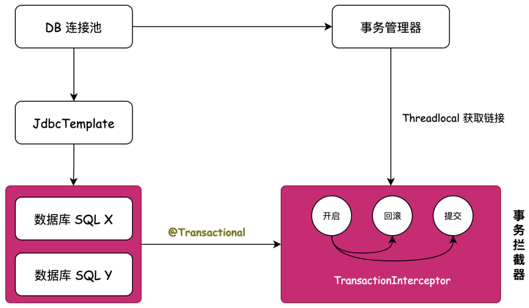 虽然就这么一小块内容,但在小傅哥最开始手写Spring的时候,也是给漏下了。直到到测试的时候,才发现链接发现事务总是不成功,最初还以为是整个切面逻辑没有切进去或者是我的操作方式有误。直到逐步排查调试代码,发现原来多个SQL的执行竟然不是获得的同一个链接,所以也就没法让事务生效。