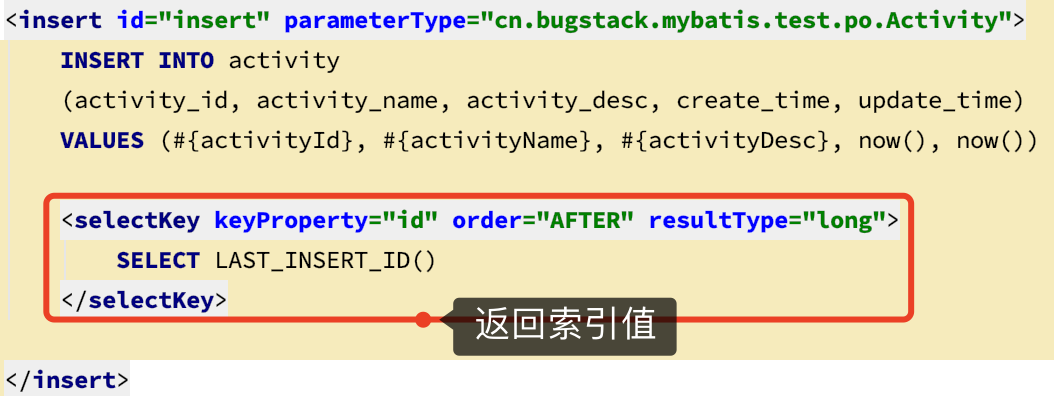 就是这个 selectKey 的配置,在执行插入SQL后,开始执行获取最后的索引值。 -