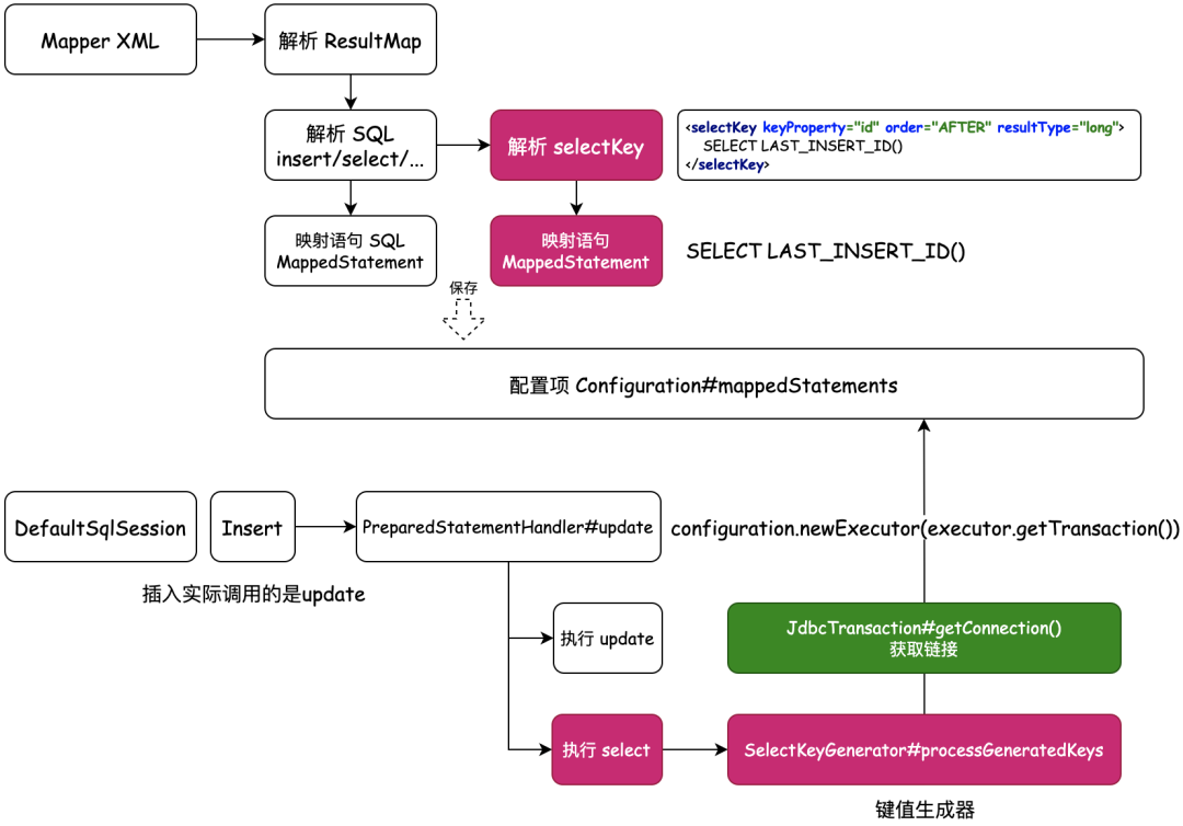Mybatis 的处理过程可以分为两个大部分来看,一部分是解析,另外一部分是使用。解析的时候把 Mapper XML 中的 insert 标签语句解析出来,同时解析 selectKey 标签。最终解析完成后,把解析的语句信息使用 MappedStatement 映射语句类存放起来。便于后续在 DefaultSqlSession 执行操作的时候,可以从 Configuration 配置项中获取出来使用。