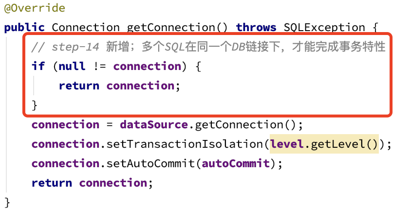 而因为这部分最开始手写 JdbcTransaction 实现 Transaction 接口获取连接的时候,每一次都是新的链接,代码块如下;