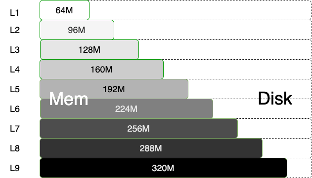 具体策略:作业 Partition文件可用内存量跟作业优先级成正比,优先级越高,单个Partition 文件可用内存越多。这样,既能保障高优先级作业尽量用内存,又能保障足够小的作业使用内存。我们的线上作业分为9级,最低一级的作业每个 Partition 可用内存为64M,每升一级,可用内存增加32M,如图7所示。