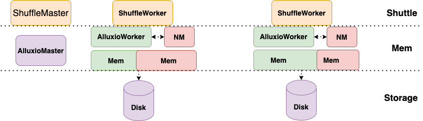 Shuttle[2]已经基于HDFS,CubeFS等以磁盘存储介质的分布式文件系统的 Remote Shuffle,显著提升了shuffle的性能和稳定性。显著我们使用Alluxio作为Shuttle的底层缓存数据的底座,性能再次飞升。我们先介绍一下整体架构: