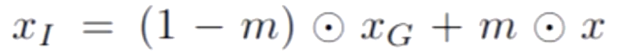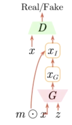 这里的m是一个二值化的掩膜,即一个和x一样大的矩阵,它的值只有0和1。0乘以x中的像素点直接置为0,而1会保留x中的像素点的值。最后联合x和一同送入鉴别器D中来判别它们是否是一致的。我们希望我们的判别结果是一致的,这就意味着能驱动判别器D来识别到图片的某一块的特征。一旦该模型训练完备之后,就可以单独将鉴别器提取出来用在别的分类器中去。也可以用于构建别的loss设计的一部分,相当于一个表征或特征抽取器。