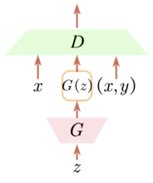 这里的鉴别器D依然是一个二分类器,生成器G生成数据的时候的输入包含了未标注数据x,还包含了某一分布的随机初始矩阵z,来共同生成,再由