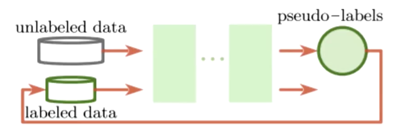 半监督学习的大量数据是没有标签的,那么我们使用模型来预测一个标签,然后再送进模型训练。
