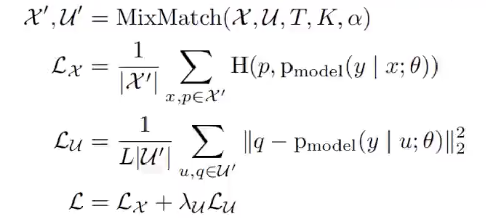 它取的有标记数据和无标记数据的BatchSize是一样大的,不过无标记数据会经过K个增强。首先会对有标记数据进行增强,再对无标记数据进行K次增强,再将增强后的无标记数据送入模型,每一种增强的无标记数据会预测一个结果,将结果取均值,然后再锐化。之后会得到有标记的数据,和无标记数据以及猜测出的标记,然后将这两种数据给拼接(concat)起来,组合成一个大的数据,再随机打乱与有标记数据和带猜测标签的无标记数据进行混合。最后再送入模型,求损失函数。
