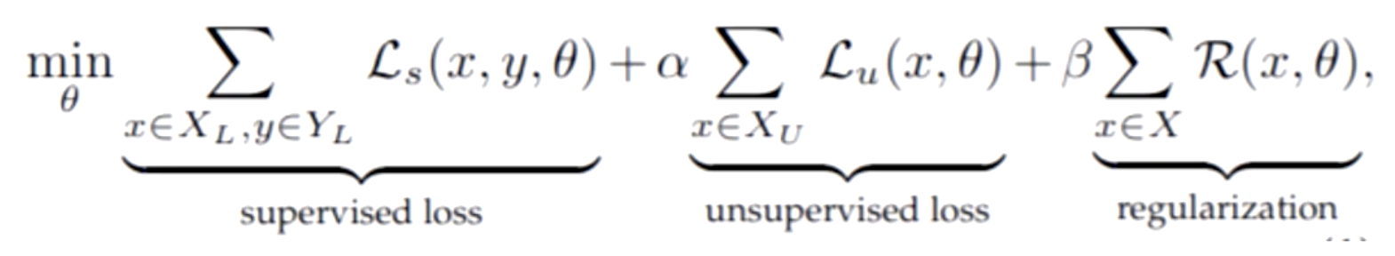 半监督学习最核心的其实就是它的损失函数,它一般包含三个部分,第一部分就是有监督的loss(supervised loss),第二部分就是无监督的loss(unsupervised loss)以及第三部分正则项(regularization)。因为半监督学习有少量的有标签的数据,那么第一部分就是这些有标签数据的loss;当然还有大量的未标注的数据,第二部分就是这些未标注数据的loss;第三部分可以用L1、L2正则,也可以是一致性正则。