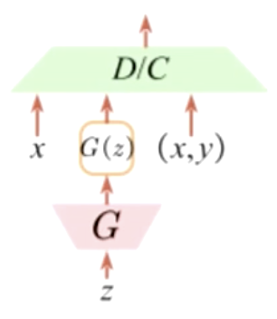 它跟第一种重用判别器很像,多了一个C(类别)。前面的步骤是相同的,只是在最后在判别器D这里多了一个类别,不是K个类别而是K+1个类别。多出来的这个类别就是生成器生成的G(z)的类别,它需要跟真实的K个类别的某一个类别要接近,这就是它的目的。