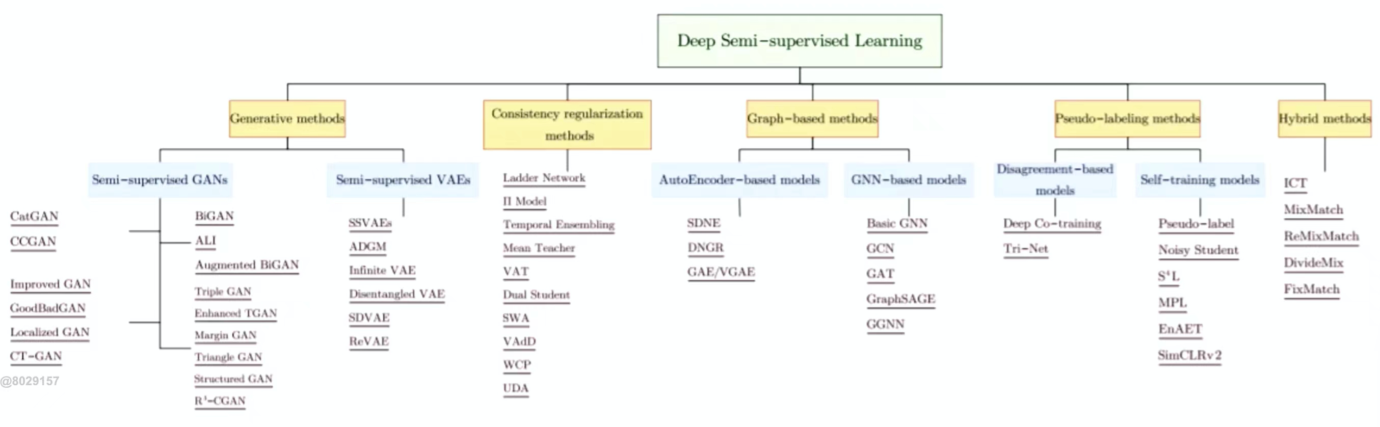 半监督学习模型可以分为五大方法,第一个是生成式模型,第二个是一致性损失正则,第三个是图神经网络,第四个是伪标签的方法,第五个是混合方法。现在用的最多的是混合方法,它可以结合前面四种方法的优点。