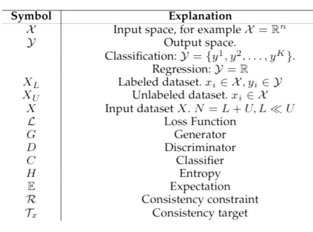 代表无标签的数据集;X就是整个的数据集,包含有标签的和无标签的;L指损失函数;G是生成器,半监督学习可以用到生成式模型;D是判别器;C是分类器;H是熵,一般指交叉熵;E是期望;R是正则项,半监督学习中一般指一致性正则,当然半监督学习也可以使用传统的L1和L2正则;